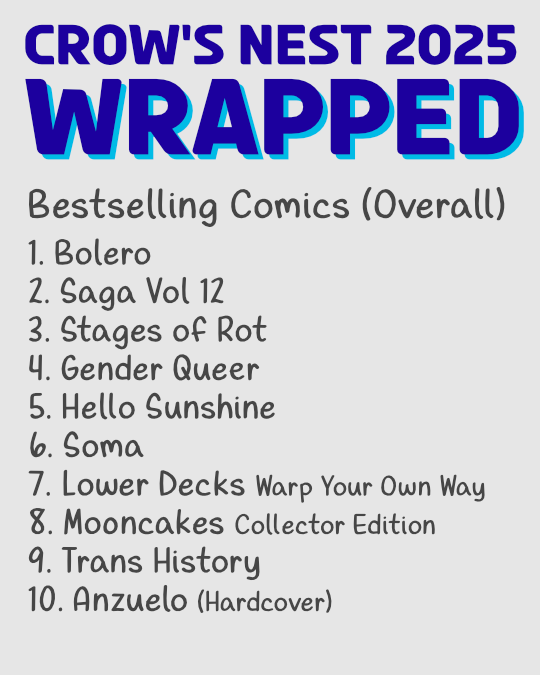 While Saga is the bestselling release of 2025 in the year, local creator Keezy Young’s Hello Sunshine was our fastest selling comic in 2025! That’s actually super impressive since Saga came out right before Free Comic Book Day and yet Hello Sunshine still outsold it if we look at the first 2 weeks of release for each comic. Thanks for supporting local creators and comics about messy queer people!