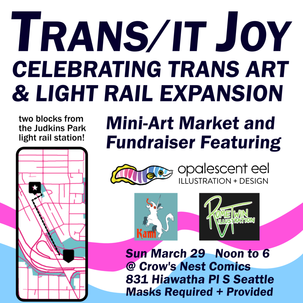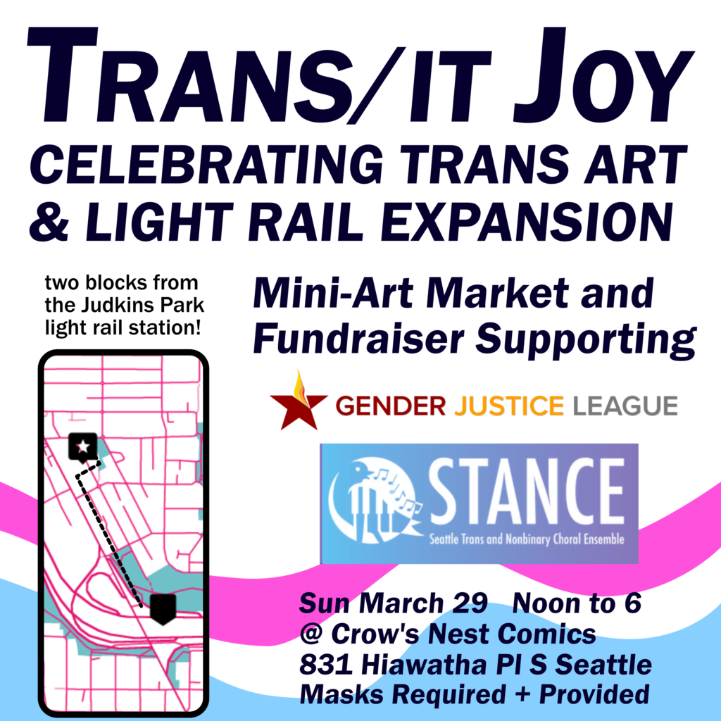 Join us for a mini art market and fundraiser to celebrate trans joy and public transit on Sunday March 29th from noon to 6pm! For our first big event in our new location we’ll be hosting several local trans artists and raise funds for Seattle area trans run non-profits on the weekend of our local Sound Transit light rail station’s opening weekend r(only two blocks away omg).